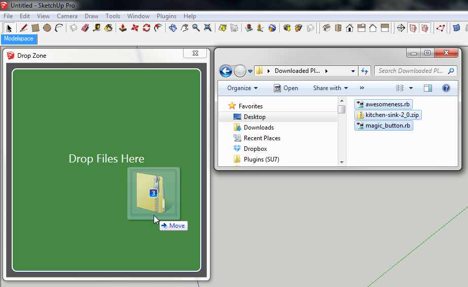 Masih mengulas tool untuk menginstall plugin pada sketchup.Kali ini kita akan mengulas Drop Zone. Seperti pada Eneroth RBZ Installer, Drop zone memiliki kemampuan untuk bisa menginstall plugin dengan cara drag and drop. Kelebihan dari plugin ini adalah, bis adipasang di versi sketchup yang jauh lebih rendah. Drop zone memperbolehkan kamu untuk bisa di pasang pada sketchup versi 8 keatas.
